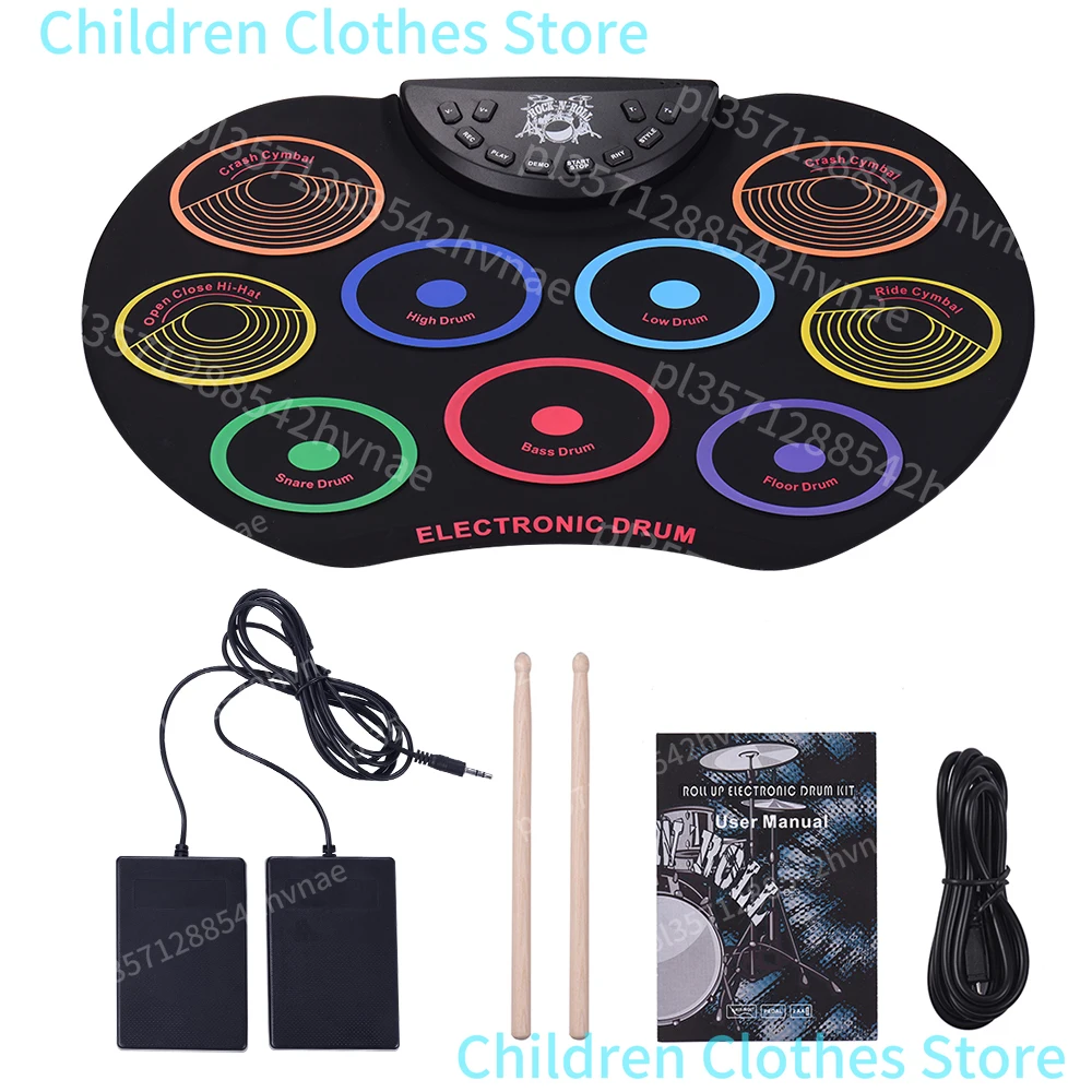 Conjunto de tambor enrolável de tamanho compacto, kit de bateria eletrônica, 9 almofadas de bateria de silicone, alimentado por usb/bateria com baquetas, pedais