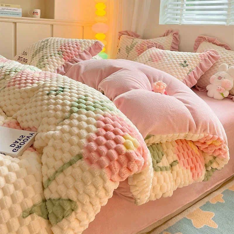 Inverno dos desenhos animados de pelúcia quente conjunto capa edredão com folha fronha 4 pçs conjunto cama têxteis para casa luxo queen size conjunto roupa cama
