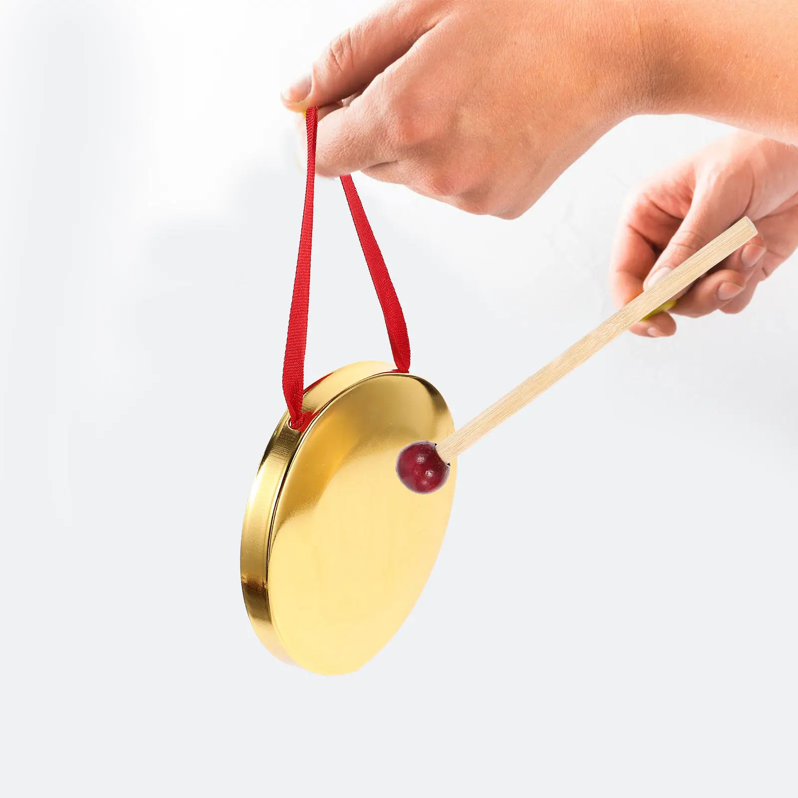 Conjunto de Gong de Cobre Pequeno de 9cm e Címbalos de Mão para Crianças, Instrumento Musical Decorativo com Elementos de Madeira e Fita para Celebrações