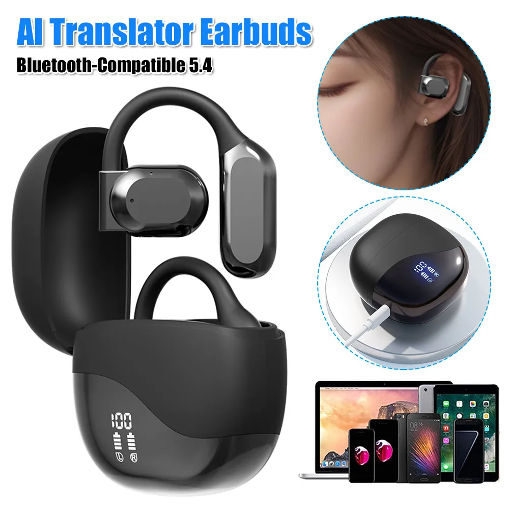 Fones de Ouvido Tradutores Bluetooth 5.4 com Cancelamento de Ruído, IA em Tempo Real, Gancho de Orelha, Voz Bidirecional, Bateria de 80mAh, Transmissão de 10M para Negócios