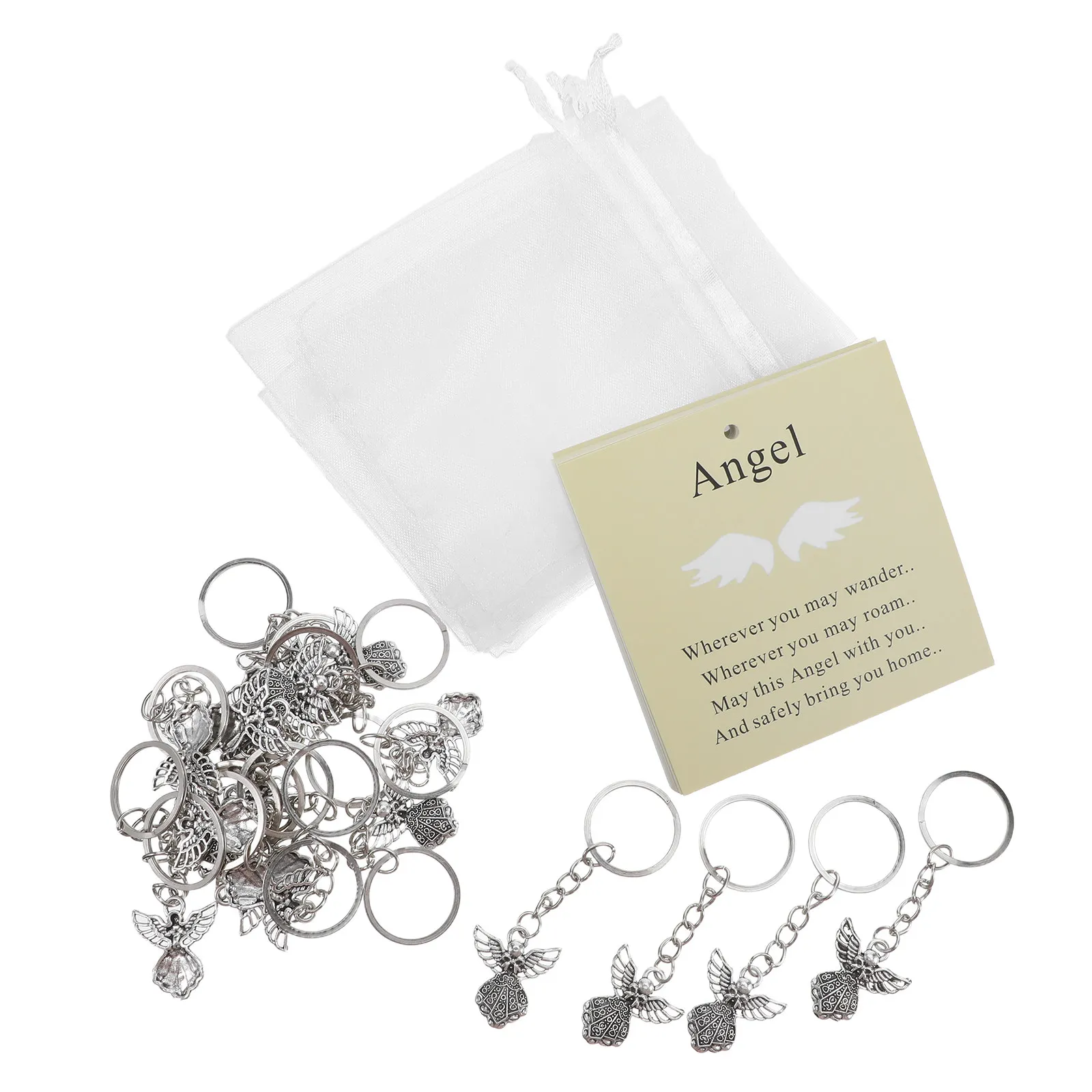 20 Conjuntos de Essenciais para Funeral: Acessórios Comemorativos, Chaveiros Asas de Anjo, Etiquetas de Agradecimento, Bolsas de Organza para Joias com Cordão
