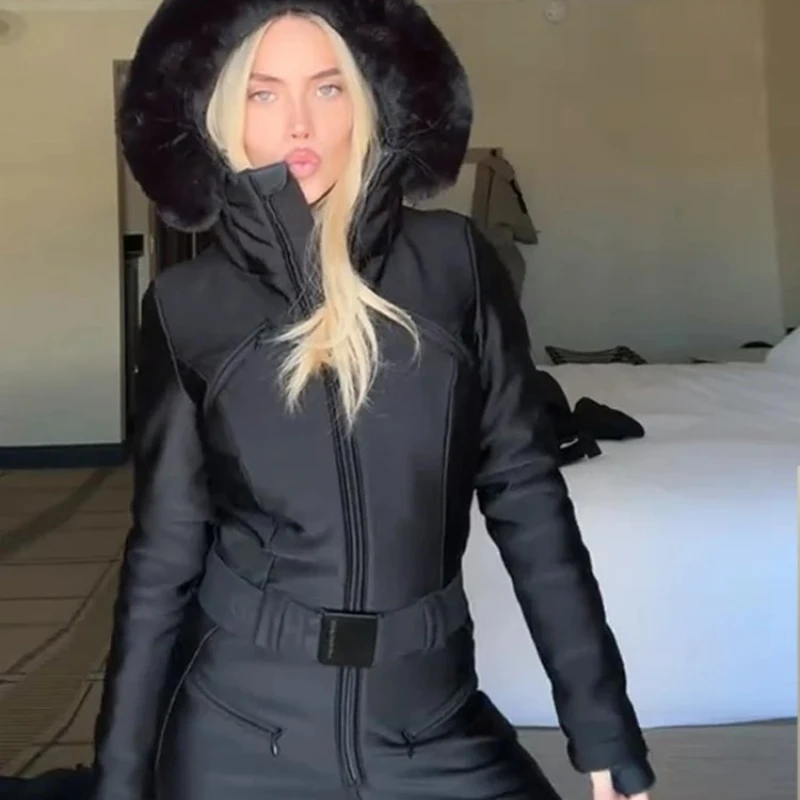 Macacão de Esqui com Capuz Feminino 2025 | Macacão de Esqui com Capuz em Patchwork e Detalhes em Pelúcia, Cintura Alta com Cinto, Bolsos com Zíper