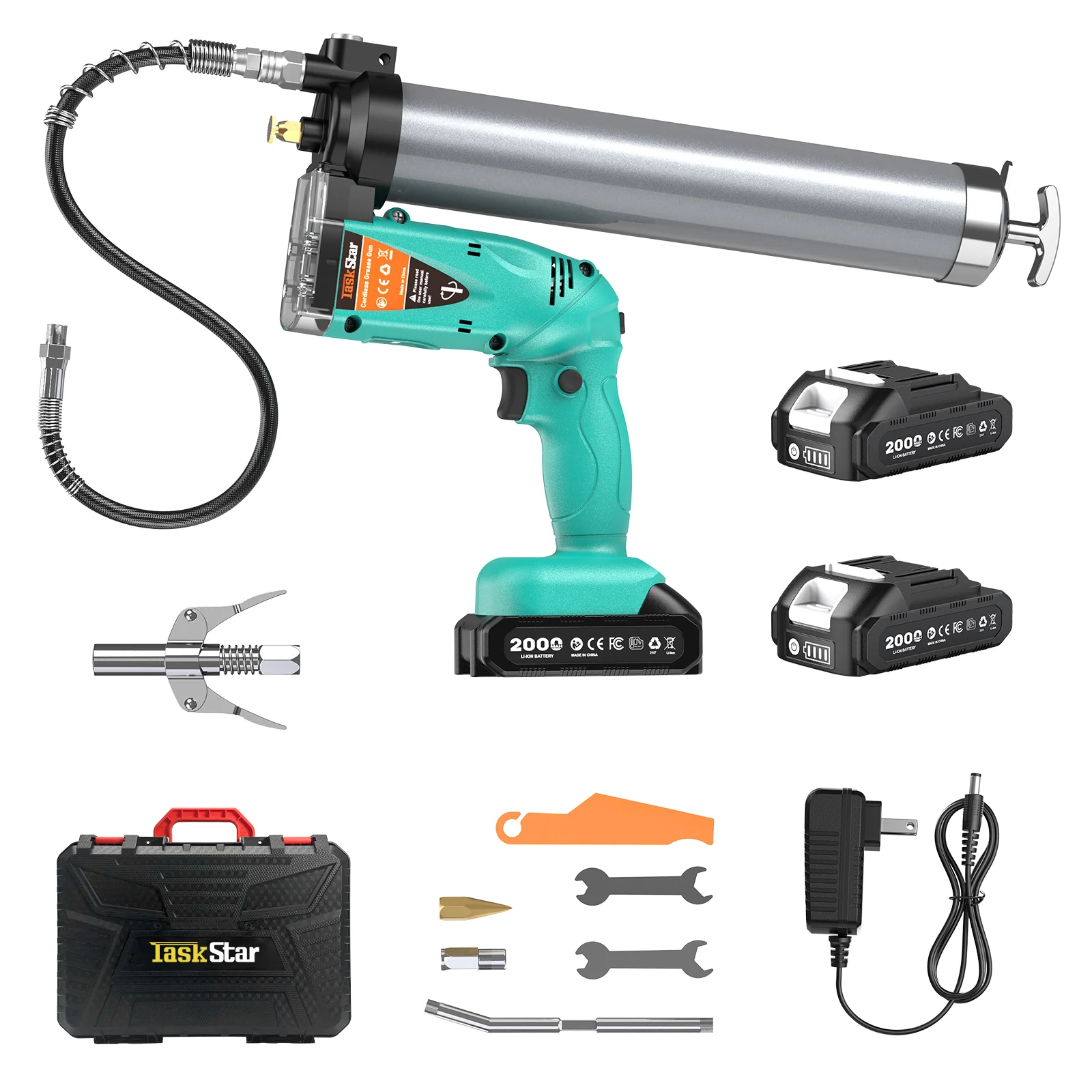 Pistola de Graxa Elétrica 2 em 1 TaskStar Aprimorada com Mangueira Flexível de 99,8 cm, Acoplador de Alça Dupla e 2 Baterias de 2.0Ah, 10000 PSI, 4.5 oz./min