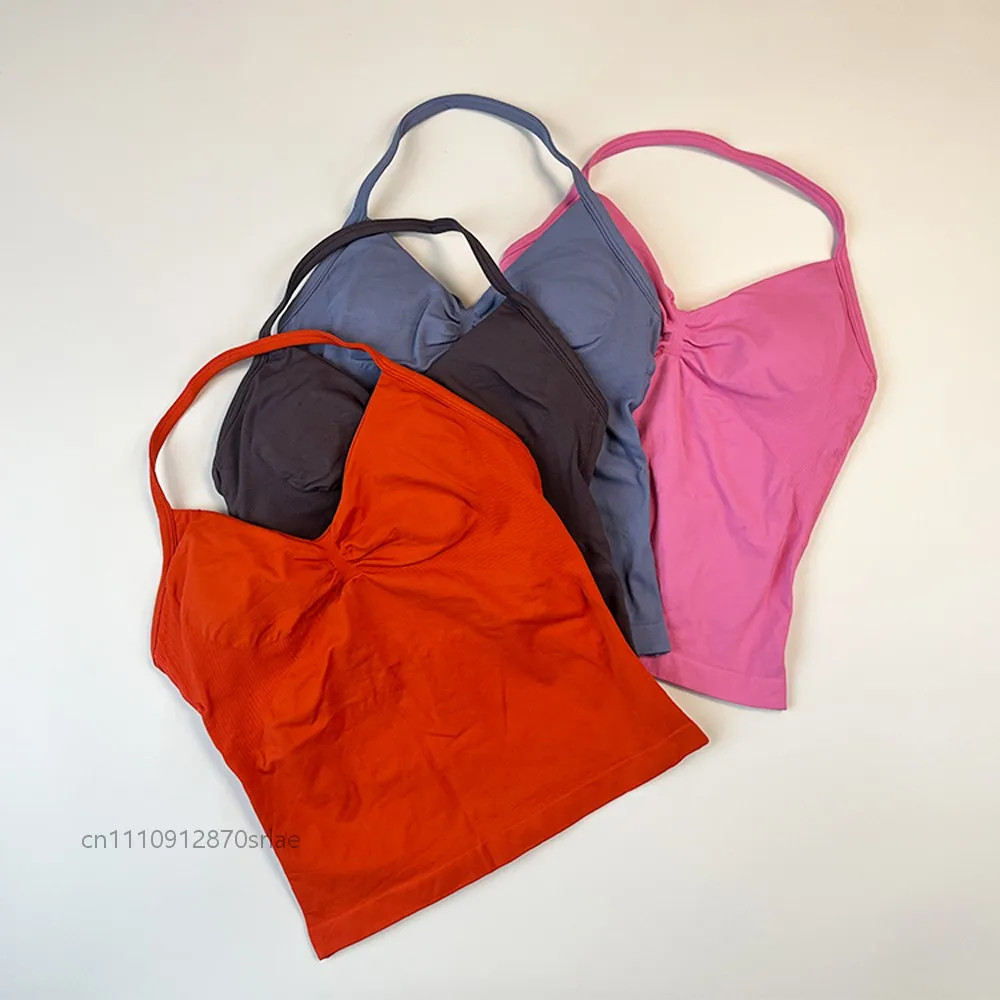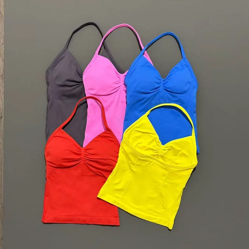 Ginásio esportes topos feminino sem costura yoga tanque com almofadas removíveis com decote em v esportes sem mangas topo esportes correndo colete de fitness