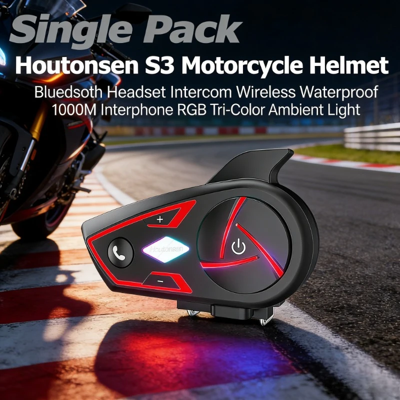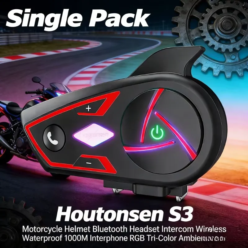 Fone de Ouvido Bluetooth para Capacete de Motocicleta Houtonsen S3, Intercomunicador Sem Fio à Prova d'Água, Interfone de 1000M com Luz Ambiente RGB de Três Cores