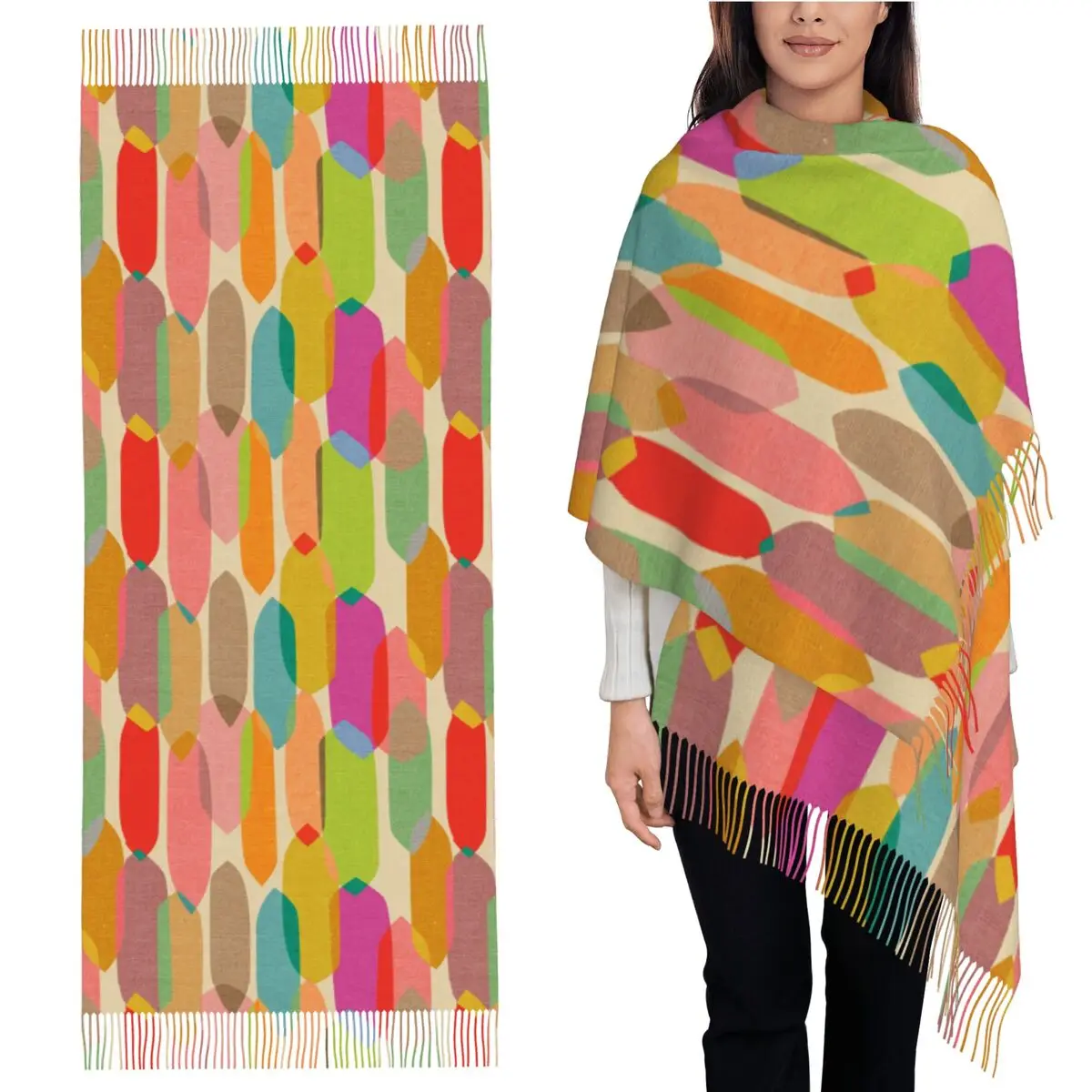 Lenço caleidoscópio com gotas de meados do século, lenços com borla, xales macios e quentes, grande, outono e inverno