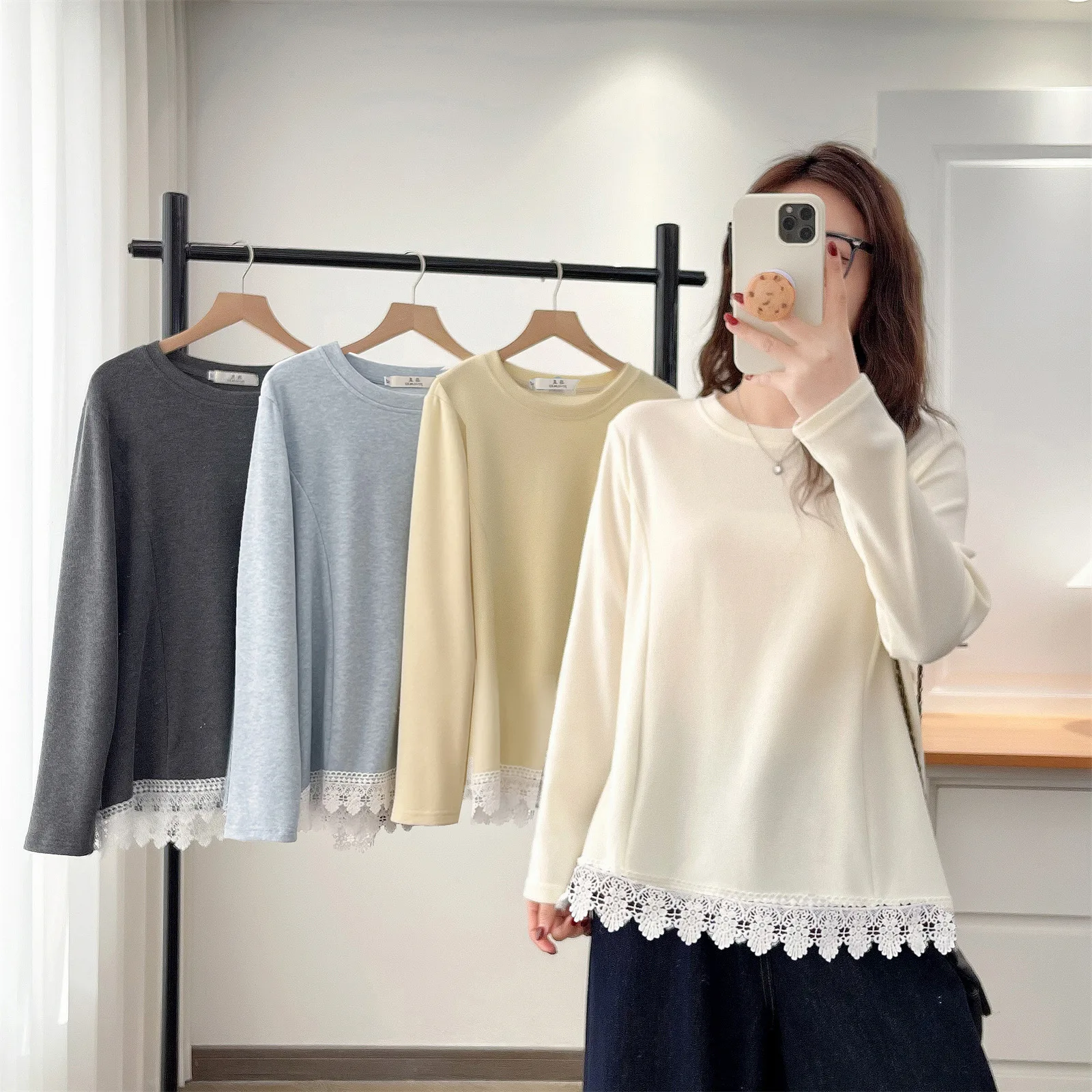 Camiseta Casual Plus Size para Mulheres, Gola Redonda, Manga Longa, Com Detalhes em Renda e Patchwork