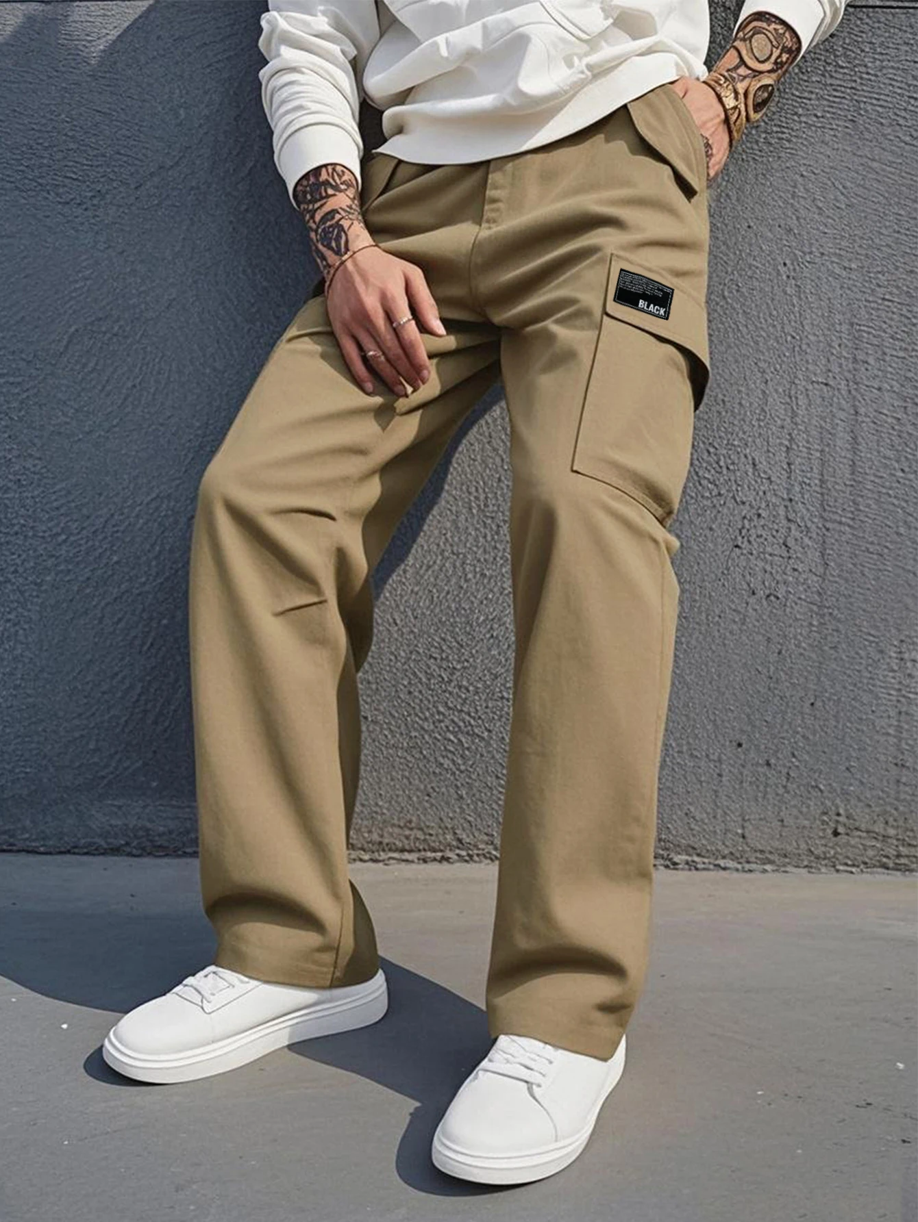 Calças de trabalho casuais masculinas de cor pura com aba lateral e bolso com botão lateral, calças de trabalho com vários bolsos de cor pura masculina, casu ao ar livre