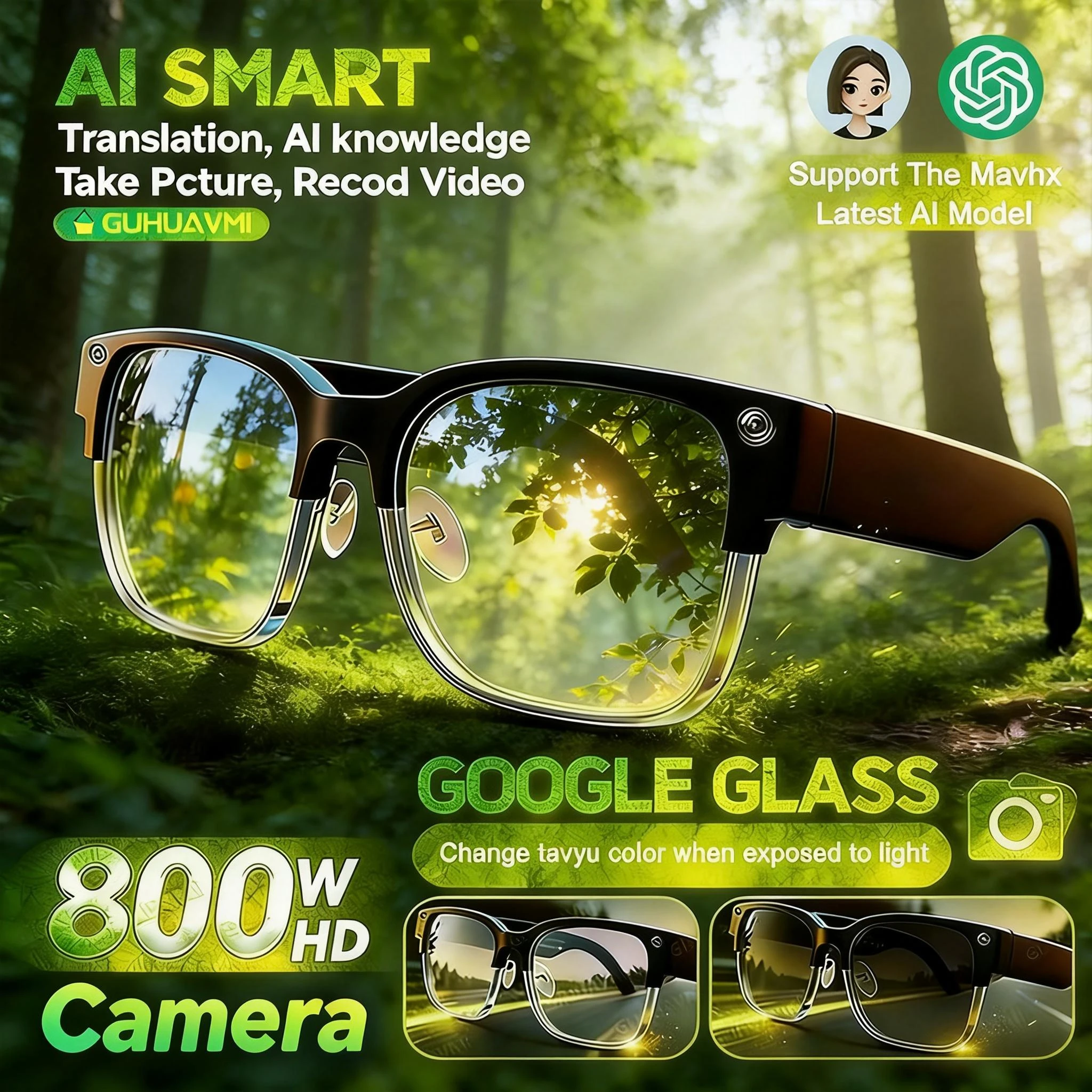 Óculos Inteligentes AI 2026 com Vídeo 4K HD, Câmera de 800W, Transferência WiFi de 32GB, Assistente de Voz, Música, Tradução Chat GPT, Óculos de Sol Masculinos
