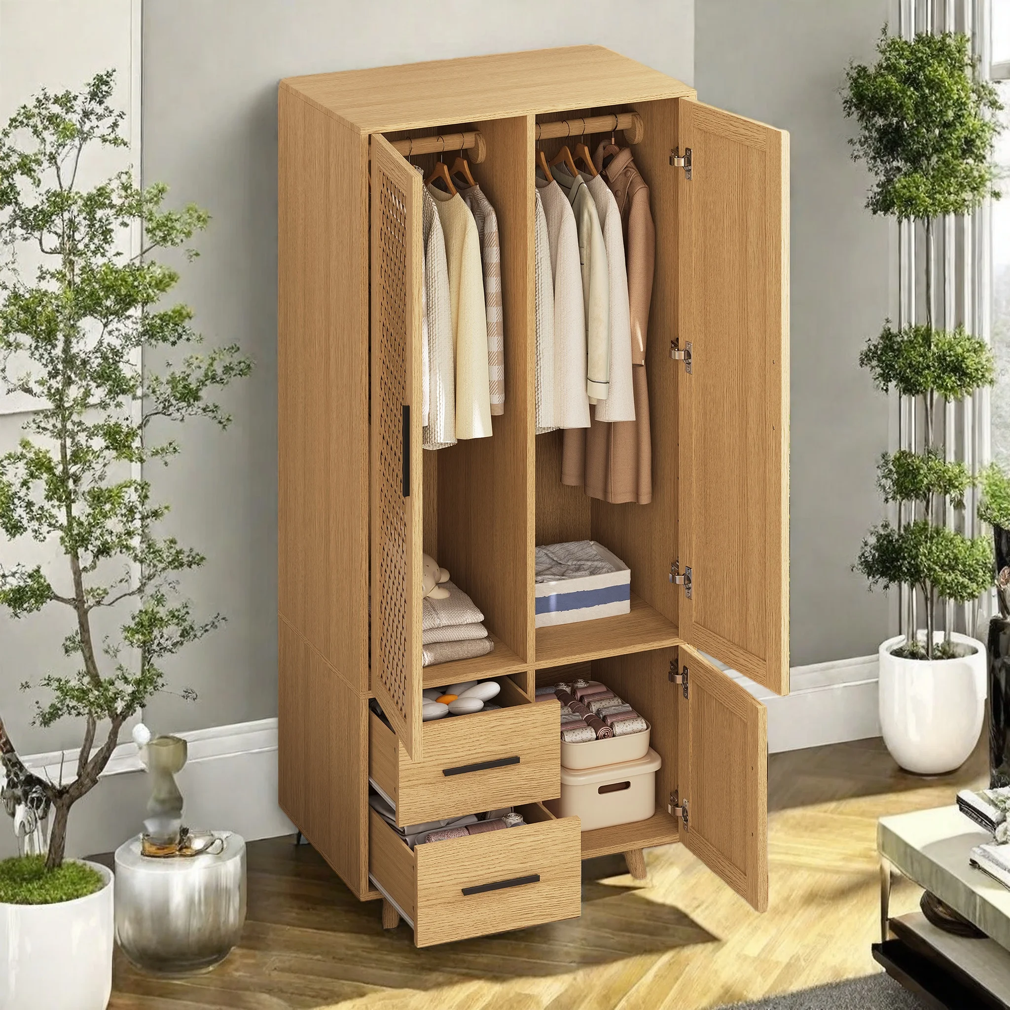 Guarda-roupa com efeito carvalho, armário para roupa de banho com 2 gavetas e puxadores de metal preto, guarda-roupa de 3 peças, guarda-roupa moderno estilo boho para quarto, modular, 176x52x80 cm