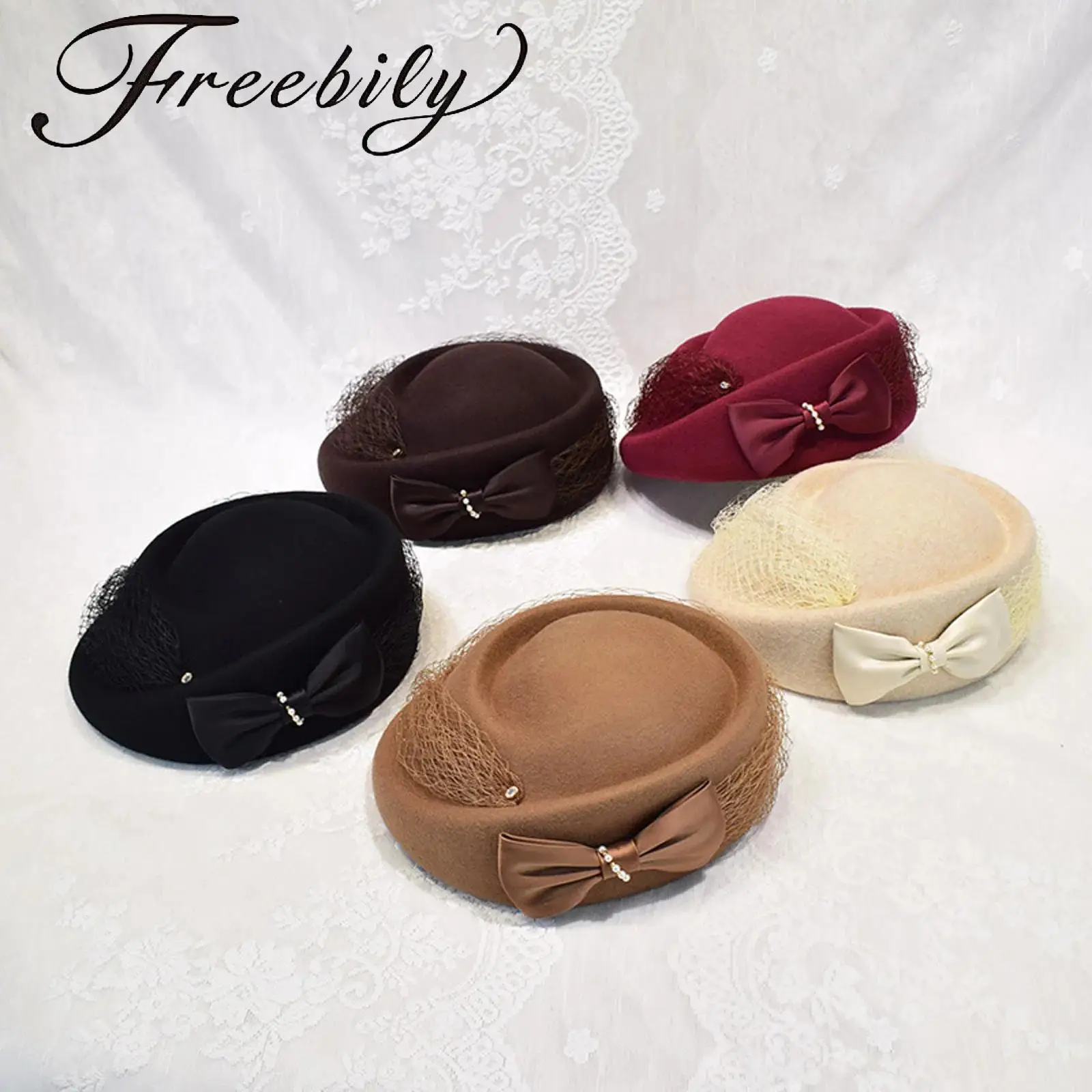 Chapéu de Lã com Laço e Pérolas Falsas para Mulheres, Chapéu de Feltro para Casamento e Igreja, Fedoras com Laço