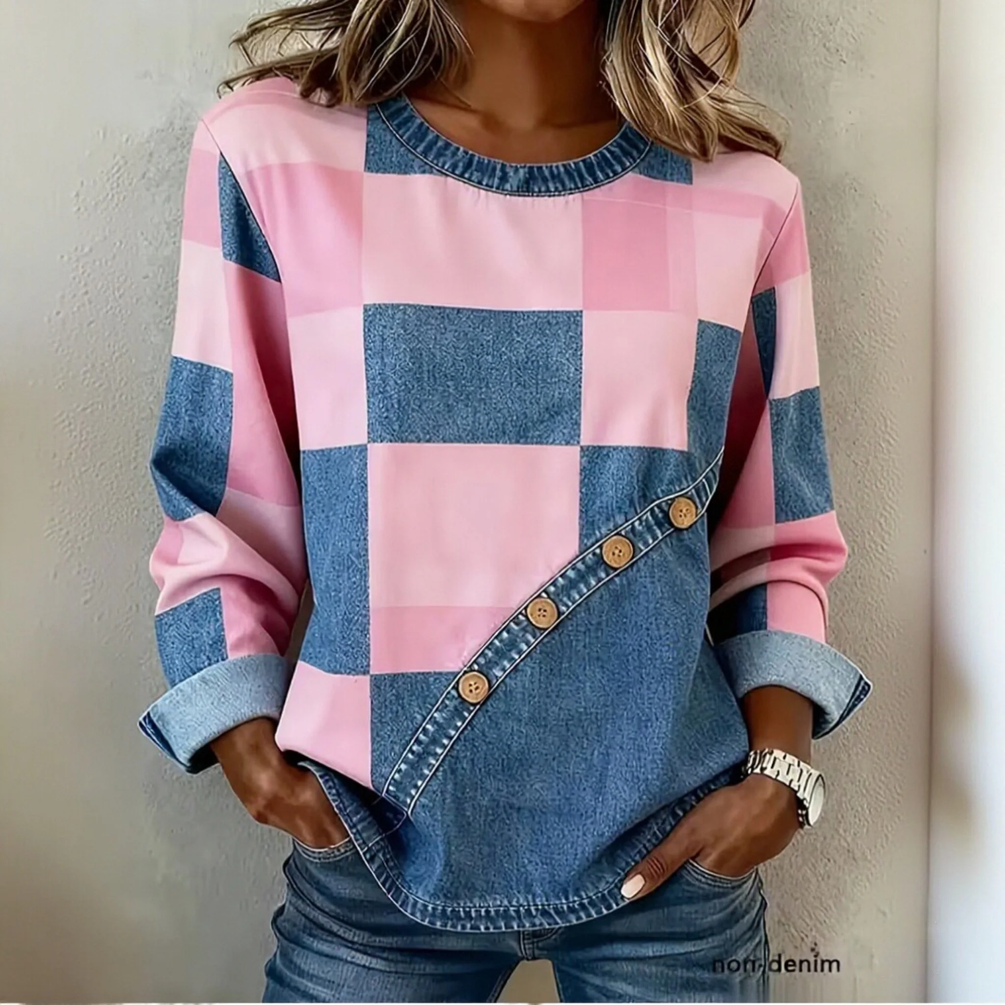 Nova Chegada 2026 Primavera Outono Blusas Femininas Casuais Soltas de Manga Longa com Gola Redonda Estampadas em Patchwork de Boa Qualidade em Algodão e Linho S159