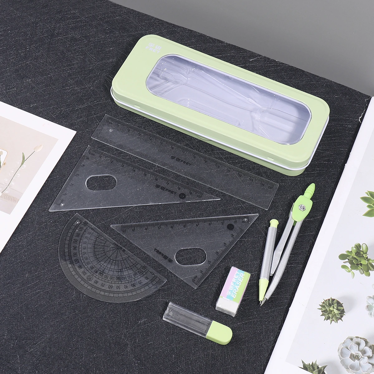 Conjunto de Ferramentas de Geometria para Estudantes com 7 Peças, Kit de Compasso, Transferidor e Régua em Cores Pastel com Estojo para Desenho Escolar e Trabalhos de Matemática
