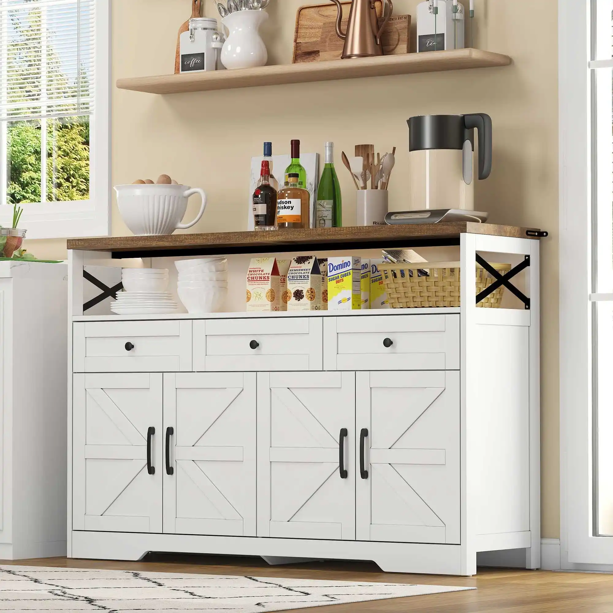 Armário de cozinha de 120 cm de largura com painéis de trabalho, guarda-roupa de armazenamento de buffet de cozinha com 2 gavetas e 4 portas para sala de estar