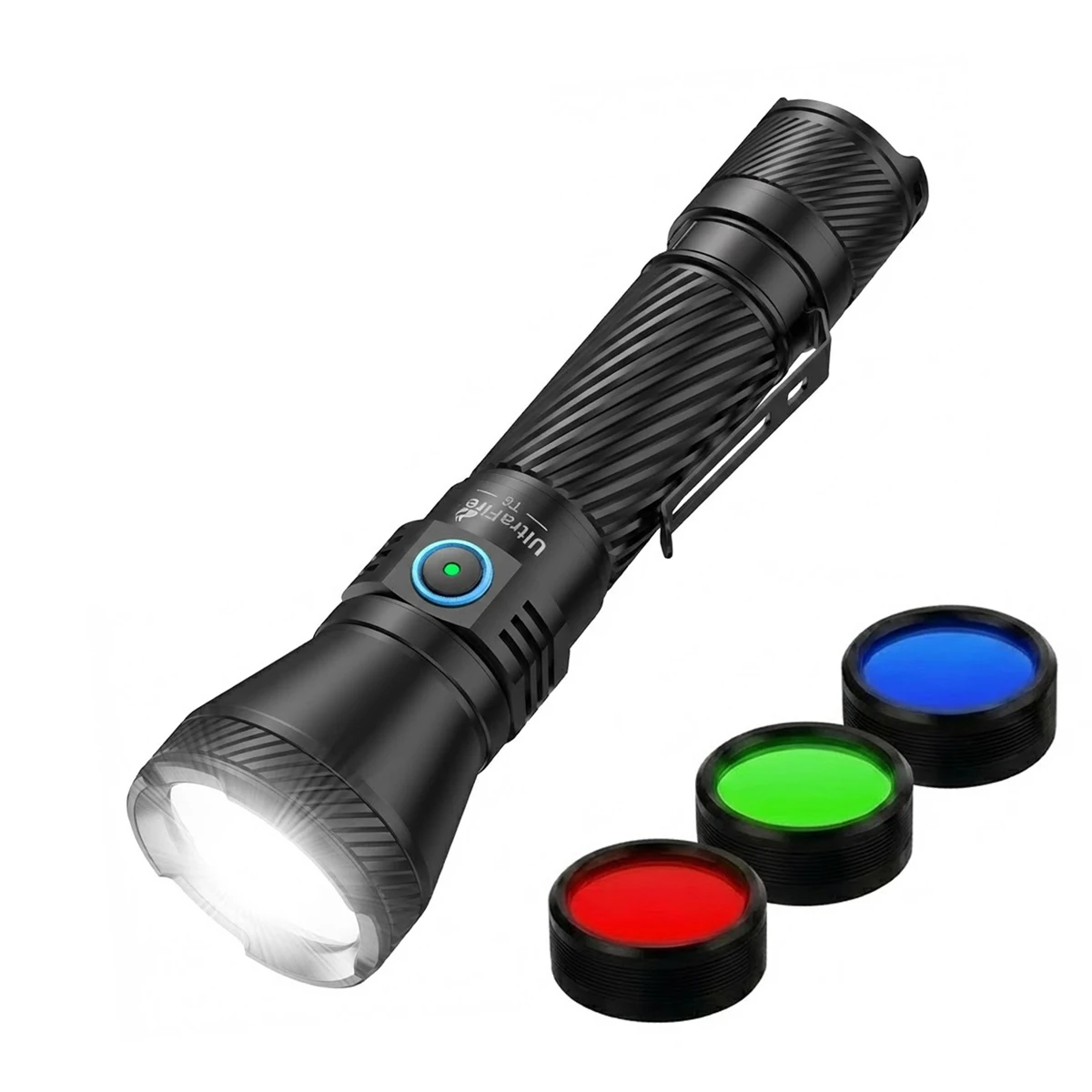 UltraFire T6 Lanterna Tática de Caça 1800 Lúmens Longo Alcance 550 Metros com Filtros Vermelho Verde Azul 21700 USB-C IP68