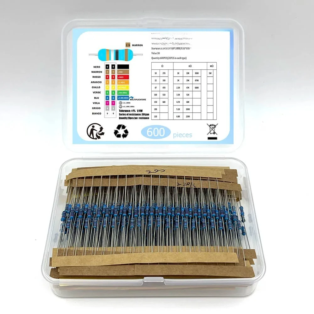 Kit de Resistores de Filme Metálico 1/4W com 300/600 Peças, 30 Valores de Resistência 10R-1M 0.25W 1%