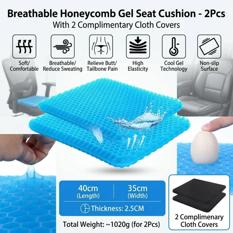 Almofada de Gel Respirável em Colmeia para Assento, Resfriamento de Verão, Alívio de Pressão, Suporte para Cóccix e Costas para Cadeira de Escritório, Carros e Casa