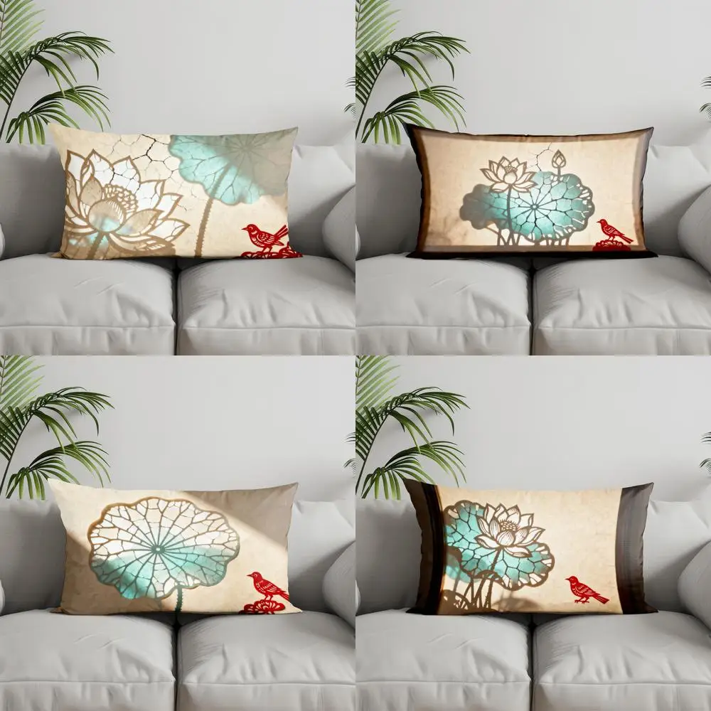 Capa de Almofada com Padrão de Lótus e Pássaro 2D, Adequada para Sofá, Quarto, Carro, Almofada Retangular