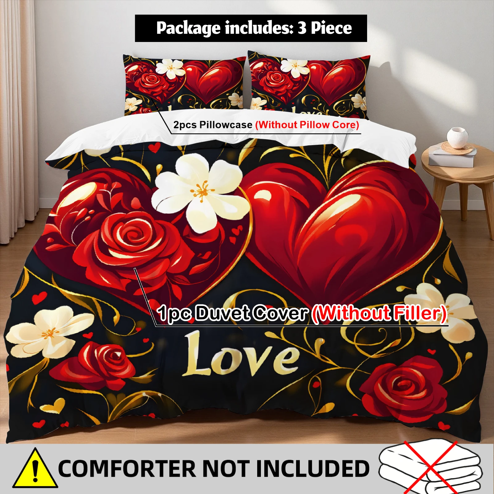 Conjunto de Capa de Edredom Romântico com Coração e Rosa, 2 Fronhas, Vermelho, Preto, Dourado, Decoração de Quarto para o Dia dos Namorados, Presente para Casais, Tamanhos Twin, Queen, King