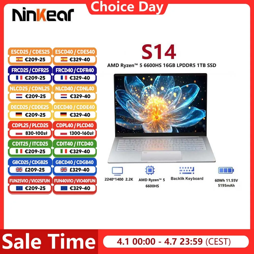 Laptop Ninkear S14 Tablet de 14 Polegadas AMD Ryzen ™ Notebook com 5 7535HS, 16GB LPDDR5, 1TB SSD, Wifi 6 e Reconhecimento de Impressão Digital