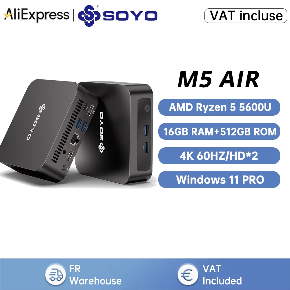 Mini PC SOYO M5 AIR com CPU AMD Ryzen 5 5600U (até 4.2 GHz), 16GB de RAM DDR4, SSD M.2 de 512GB, suporte a 4K e três monitores, Wi-Fi 6/BT 5.2.