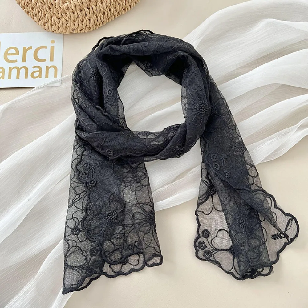Lenço de Renda Feminino Retrô Versátil, Versão Coreana, Xale Longo de Verão com Proteção Solar, Faixa de Cabelo de Seda com Flores Bordadas