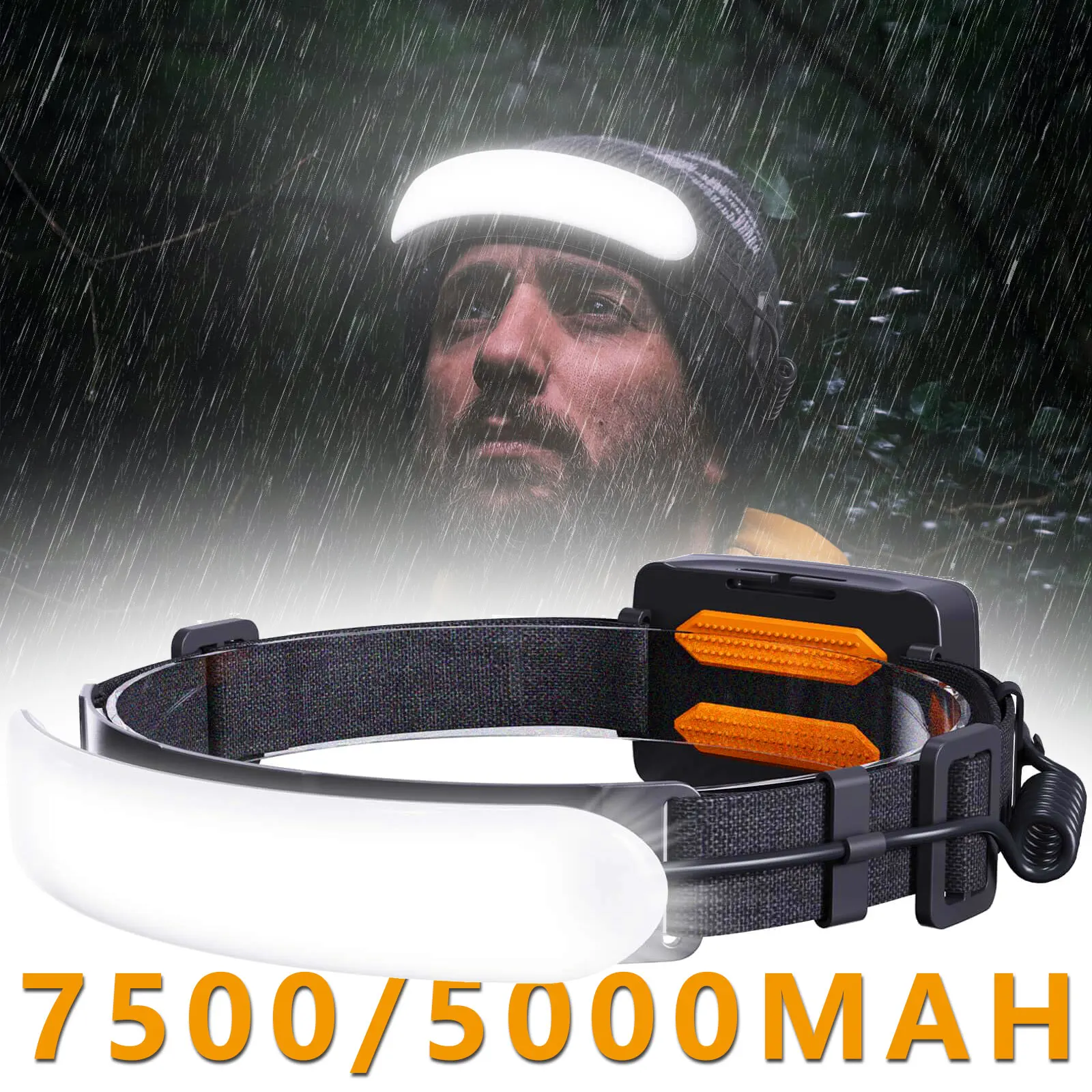 230 ° Farol de feixe largo 5000mah, lanterna de cabeça recarregável de longa duração de 7500mah para exterior e emergência