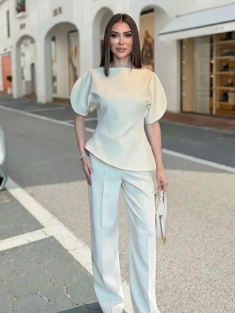 Blusa Feminina Elegante HH com Manga Bufante Sólida, Bainha Assimétrica e Gola O, Camiseta Feminina Moda Primavera 2026, Streetwear Y2K
