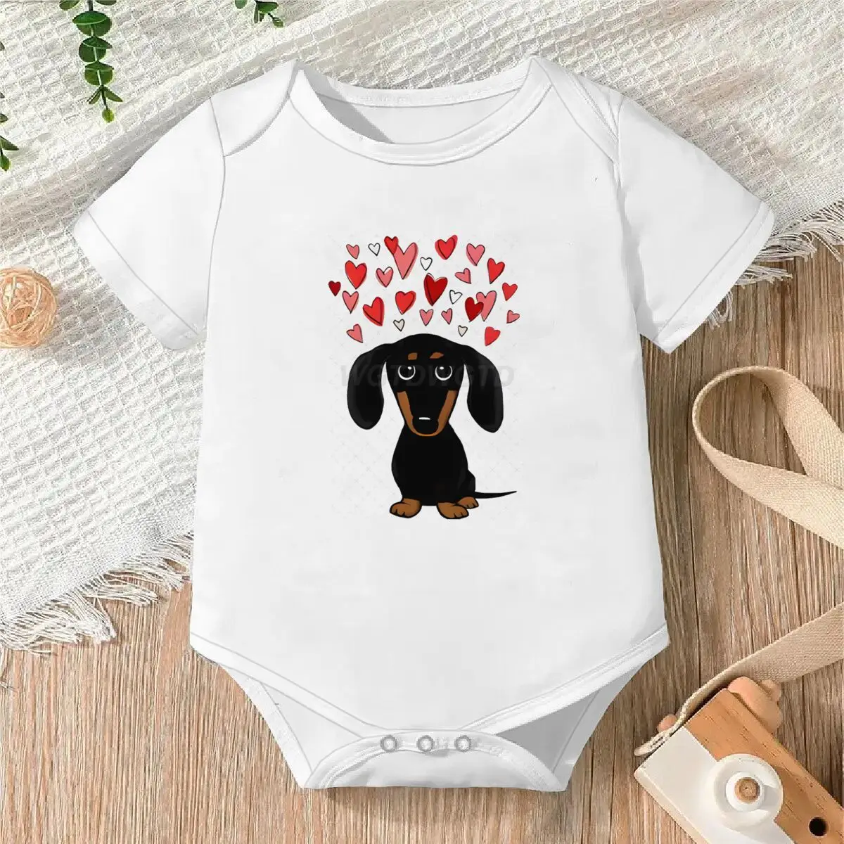 Macacão de Algodão para Bebês com Estampa de Dachshund Fofo, Romper Casual de Manga Curta para Meninas e Meninos, Bodysuits com Estampa de Dachshund e Corações