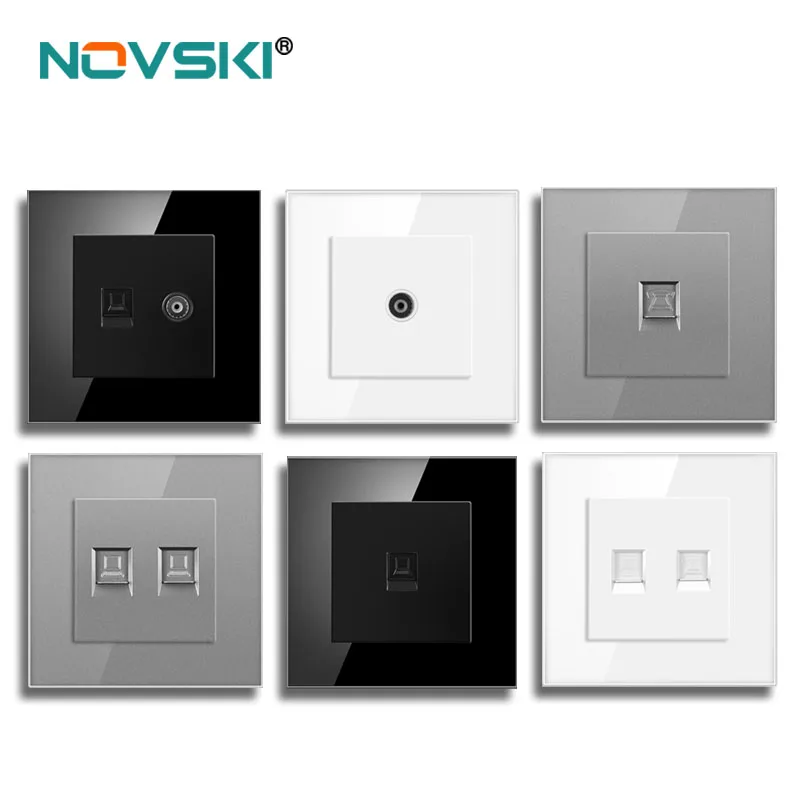 Novski painel de vidro cristal tomada parede com cat6 rj45 internet computador tomada dados tv tel tomada corrente fraca