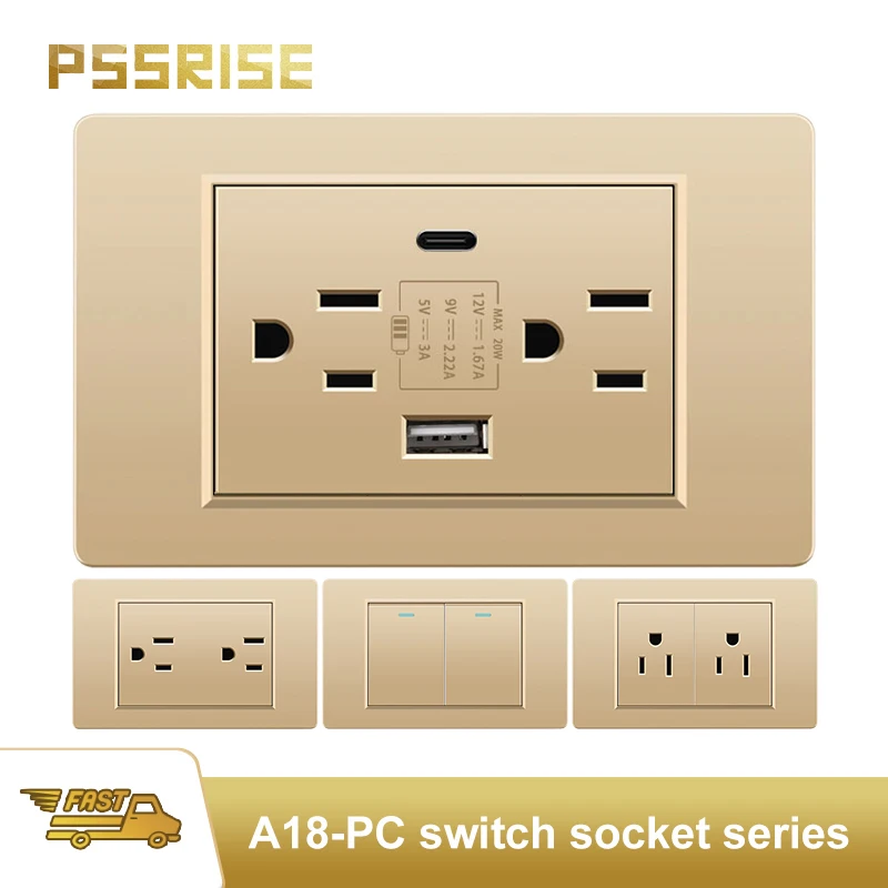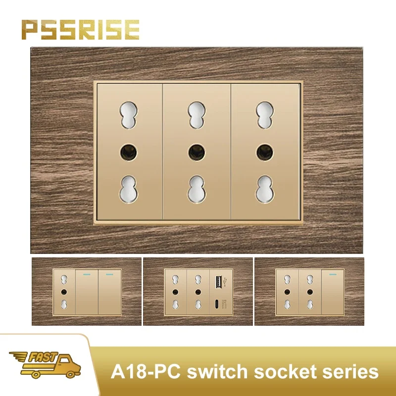 Tomada de Parede PSSRISE com Painel de Madeira Dourada, Padrão Italiano, USB Tipo C 2.1A 20W Carregamento Rápido, Interruptor de Luz, Tomada Schuko para TV e Computador
