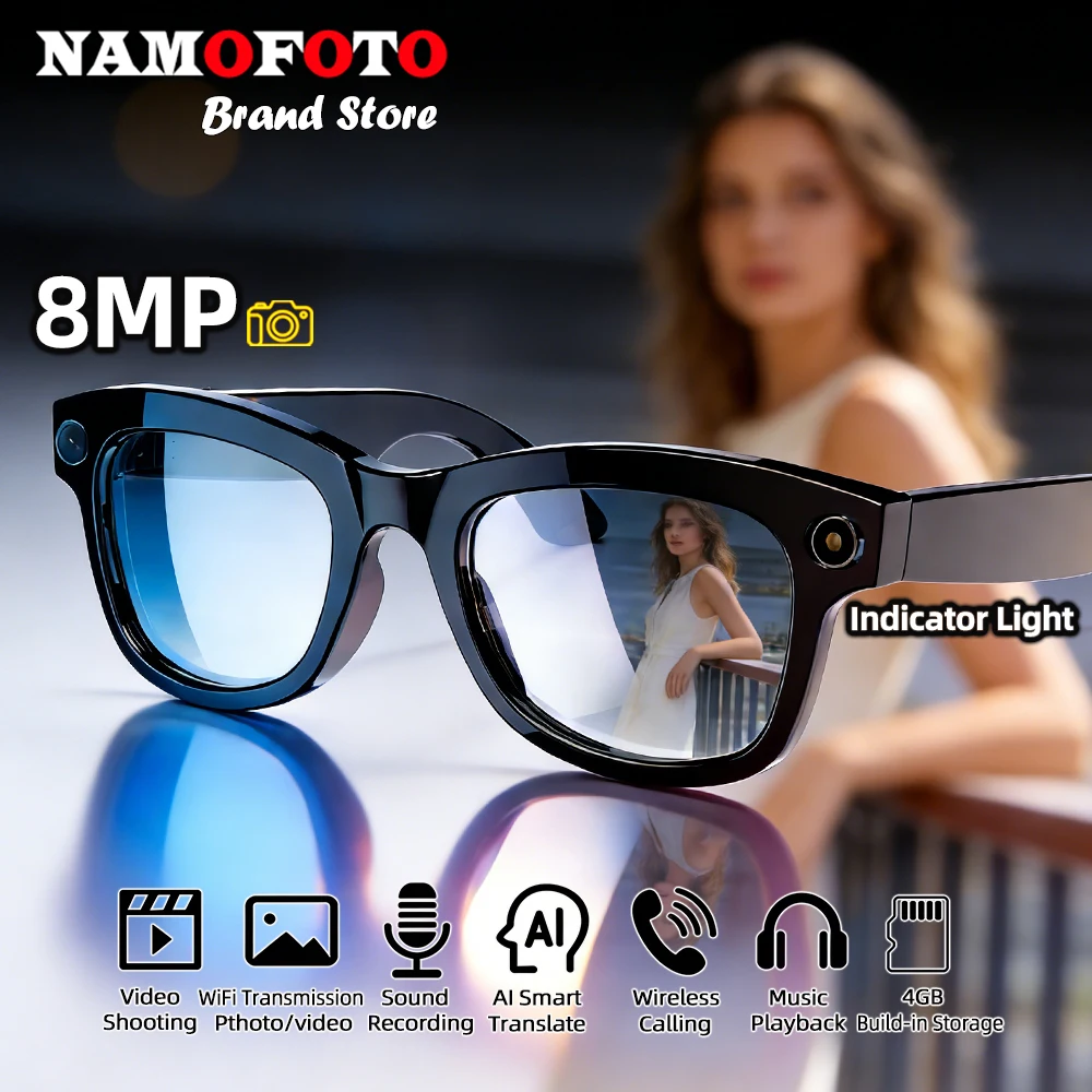 Óculos Inteligentes 2026 Novos com Câmera de 8MP, Gravação de Vídeo 1200P, Tradução em Tempo Real por IA, Gravação de Voz, Chamada BT e Reprodução de Música