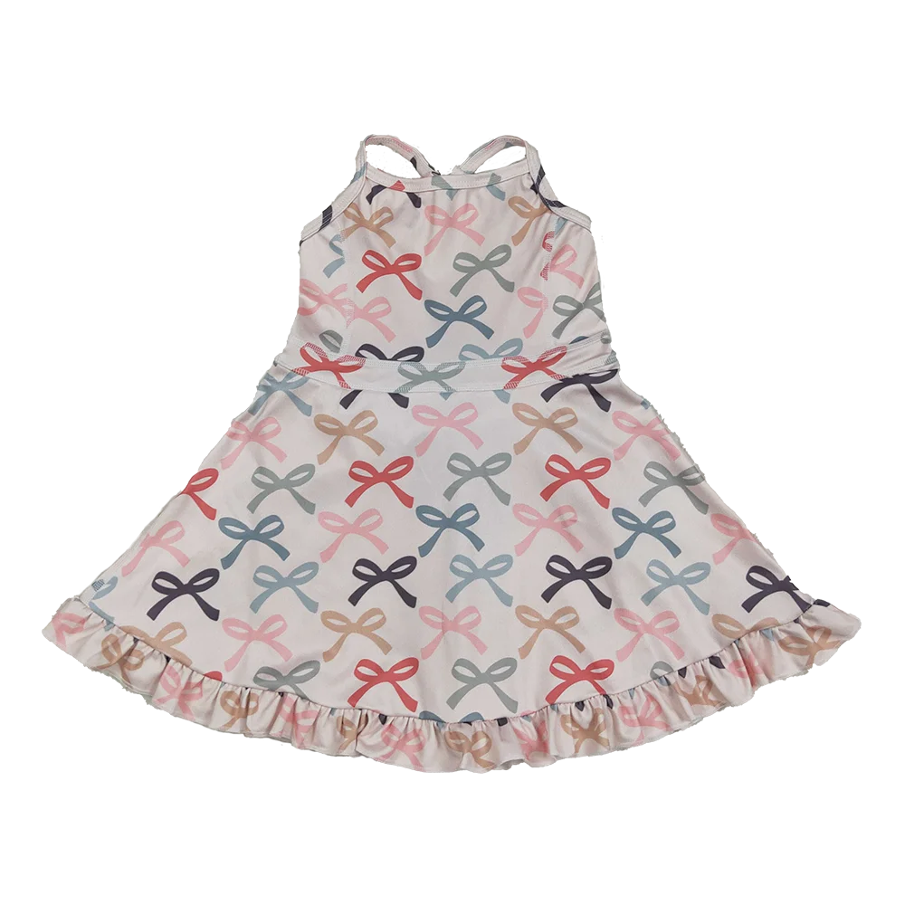 Vestidos infantis com alça pêssego e arcos coloridos para ioga com babados na altura do joelho