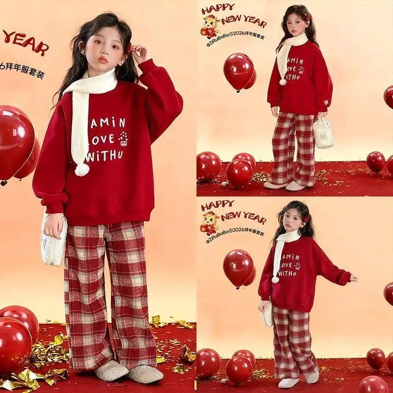 Kawaii Повседневный комплект пальто Модный комплект из 2 предметов Детская одежда для девочек 2025 Новый принт Толстовка с капюшоном в клетку Брюки Комплект из двух предметов Красный Китайский