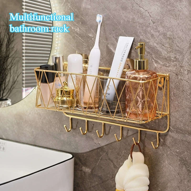 Полка для ванной комнаты без дрели - железный настенный органайзер для косметики/туалетных принадлежностей, стеллаж для хранения душа с крючками для губок