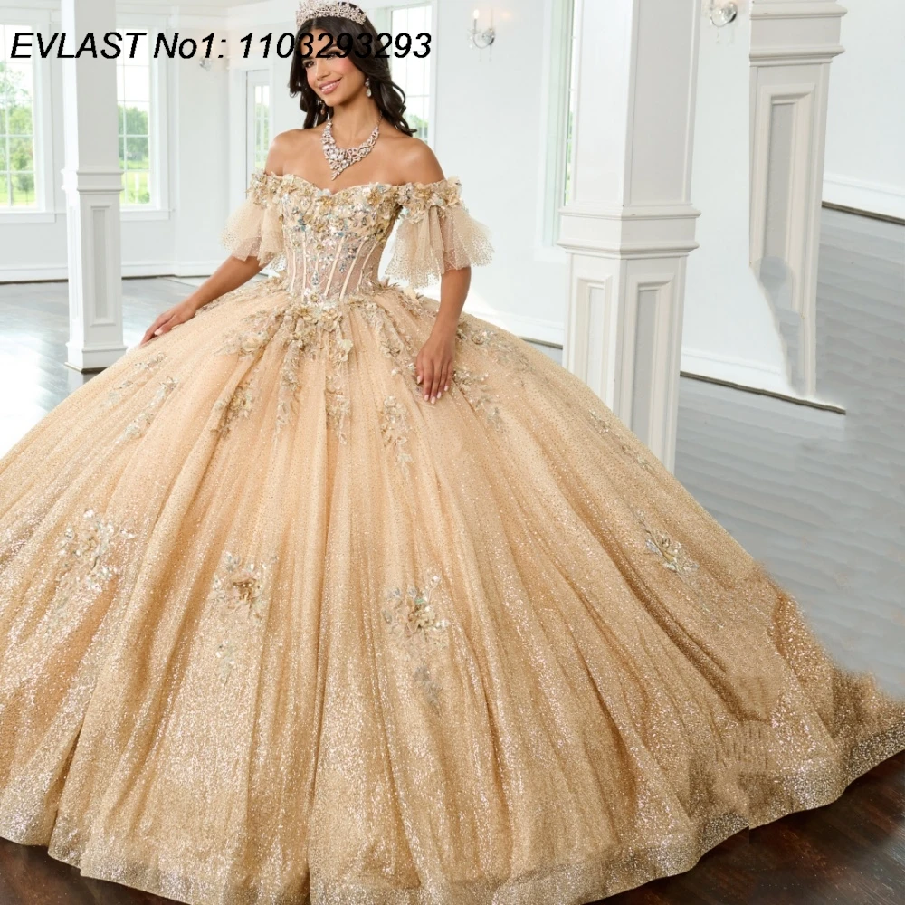 Элегантное платье для Квинсеаньеры с открытыми плечами 2026, классическое вечернее платье без рукавов, блестящее бальное платье с 3D цветами, платье для вечеринки Sweet 16