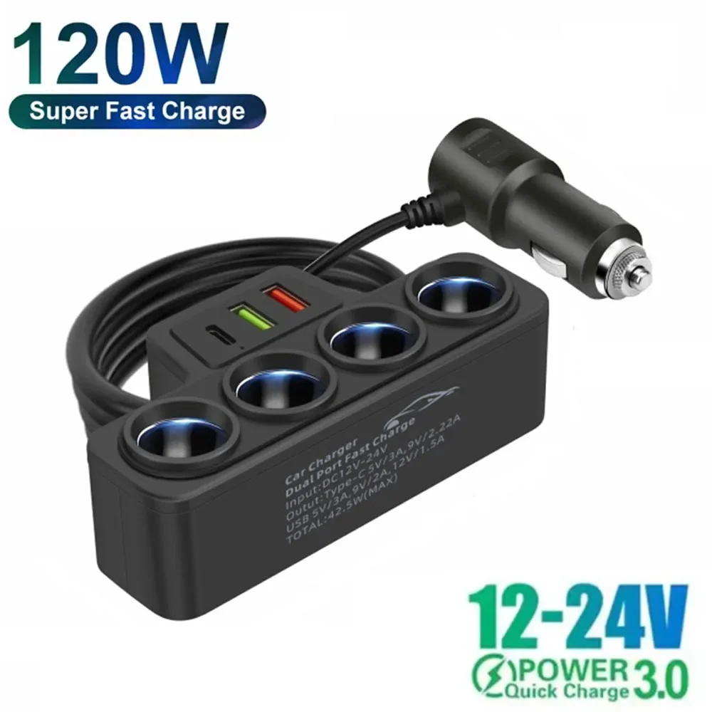 Расширямое автомобильное зарядное устройство 120 Вт, двойной прикуриватель PD USB, быстрая зарядка 12 В с вольтметром, светодиодным дисплеем для зарядных устройств для мобильных телефонов