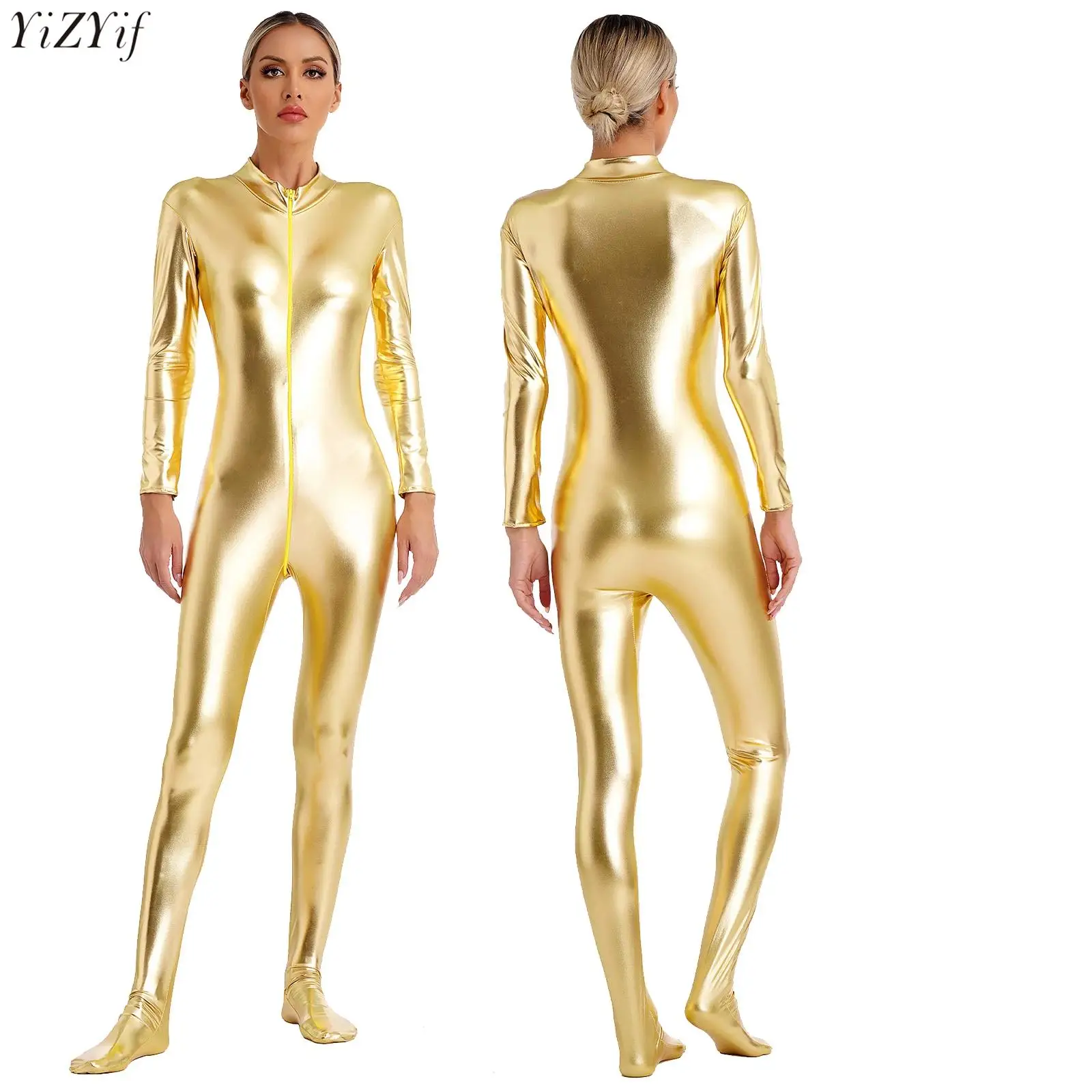 Женский металлический блестящий комбинезон зентай с мокрым эффектом и длинными рукавами на молнии спереди, комбинезон для всего тела, колготки для танцевальных выступлений, клубная одежда