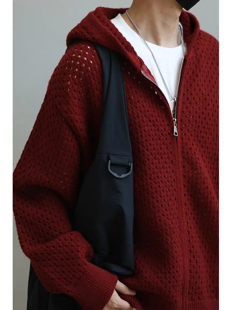 LH Store, весенне-осенний тонкий открытый кардиган с капюшоном, мужской дизайн, модный красный вязаный свитер в стиле ретро, повседневный свободный крой