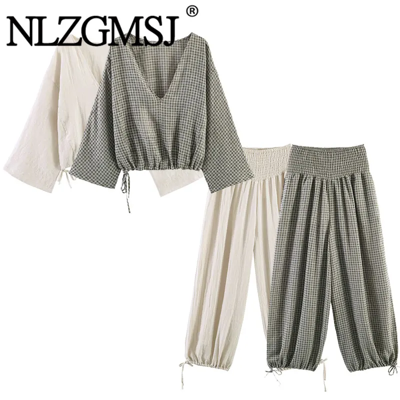 Nlzgmsj 2026 Летний женский повседневный комплект: топ в клетку с V-образным вырезом и рукавами «летучая мышь» и модные брюки-галифе с широкими штанинами и эластичной талией для повседневной носки