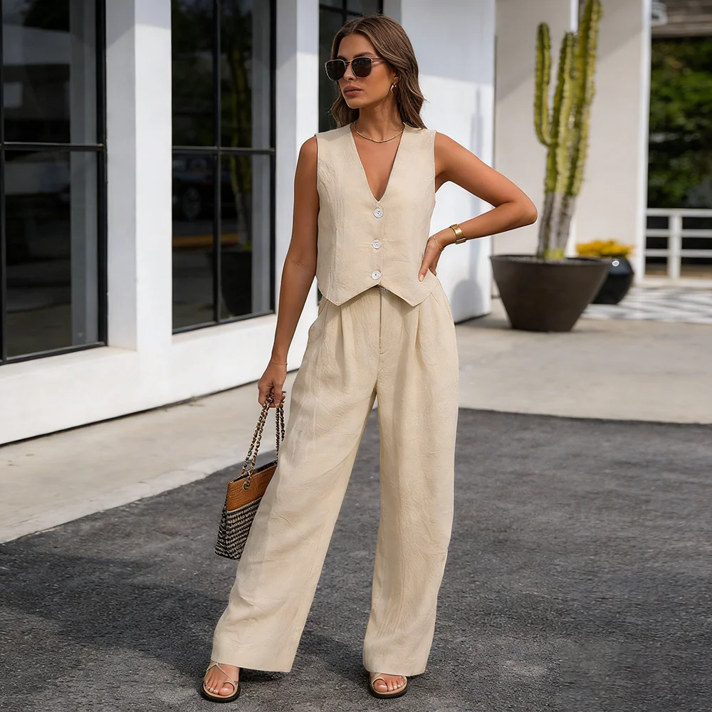 Одинаковые комплекты Кардиган Верхняя одежда Полная длина Широкие брюки Комплекты однотонных комплектов из двух предметов Свободные карманы Office Lady 2024 Сращенные