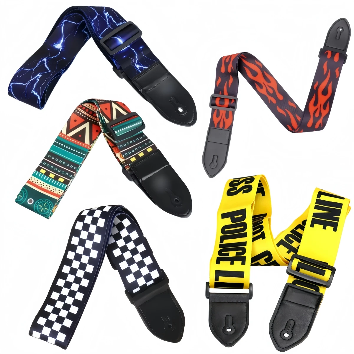 Ремешок для гитары с желтым и черным узором Регулируемая длина 80*160 см. Полиэфирная печать и кожаные концы. Универсальный ремешок Ширина 5 см