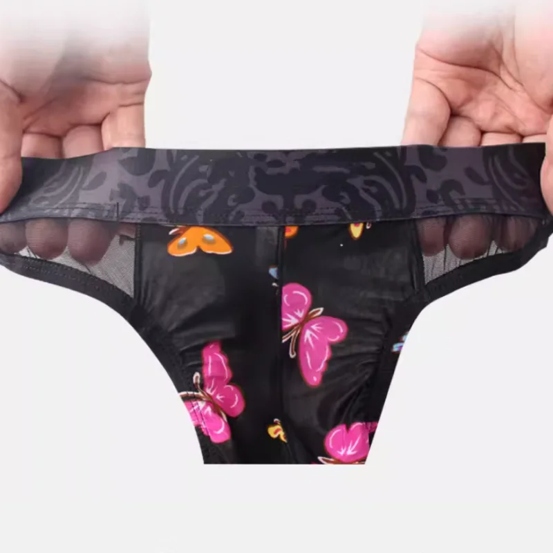 Мужские прозрачные стринги из ледяного шелка, модные сетчатые трусы-танга с вырезами и принтом, тонкие, с низкой посадкой, эластичные, интимное белье, Т-образная модель