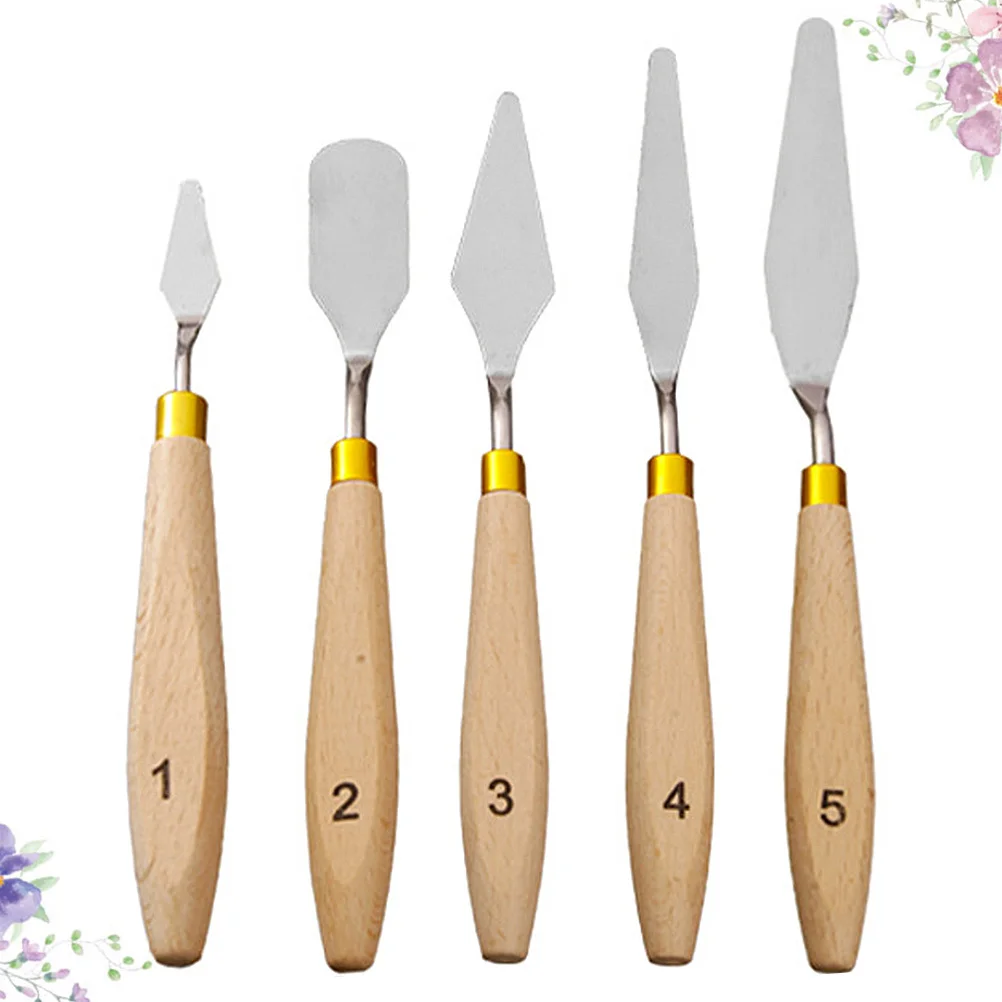 Набор из 5 аксессуаров для рисования: металлические шпатели для масляной живописи, разные формы, гладкие стальные лезвия, деревянная ручка, для художников и студентов