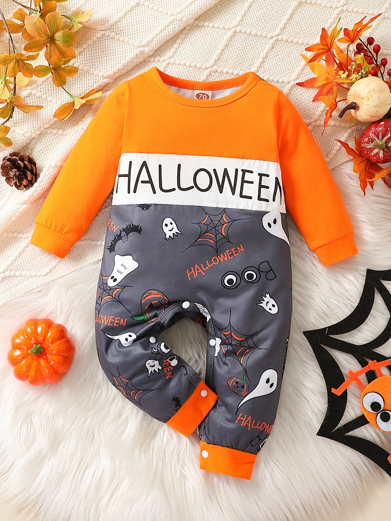 Осенний детский комбинезон на тему Хэллоуина, забавный костюм с принтом тыквы и призрака, нижняя крышка, дизайн с пуговицами, теплый тканевый костюм для детей