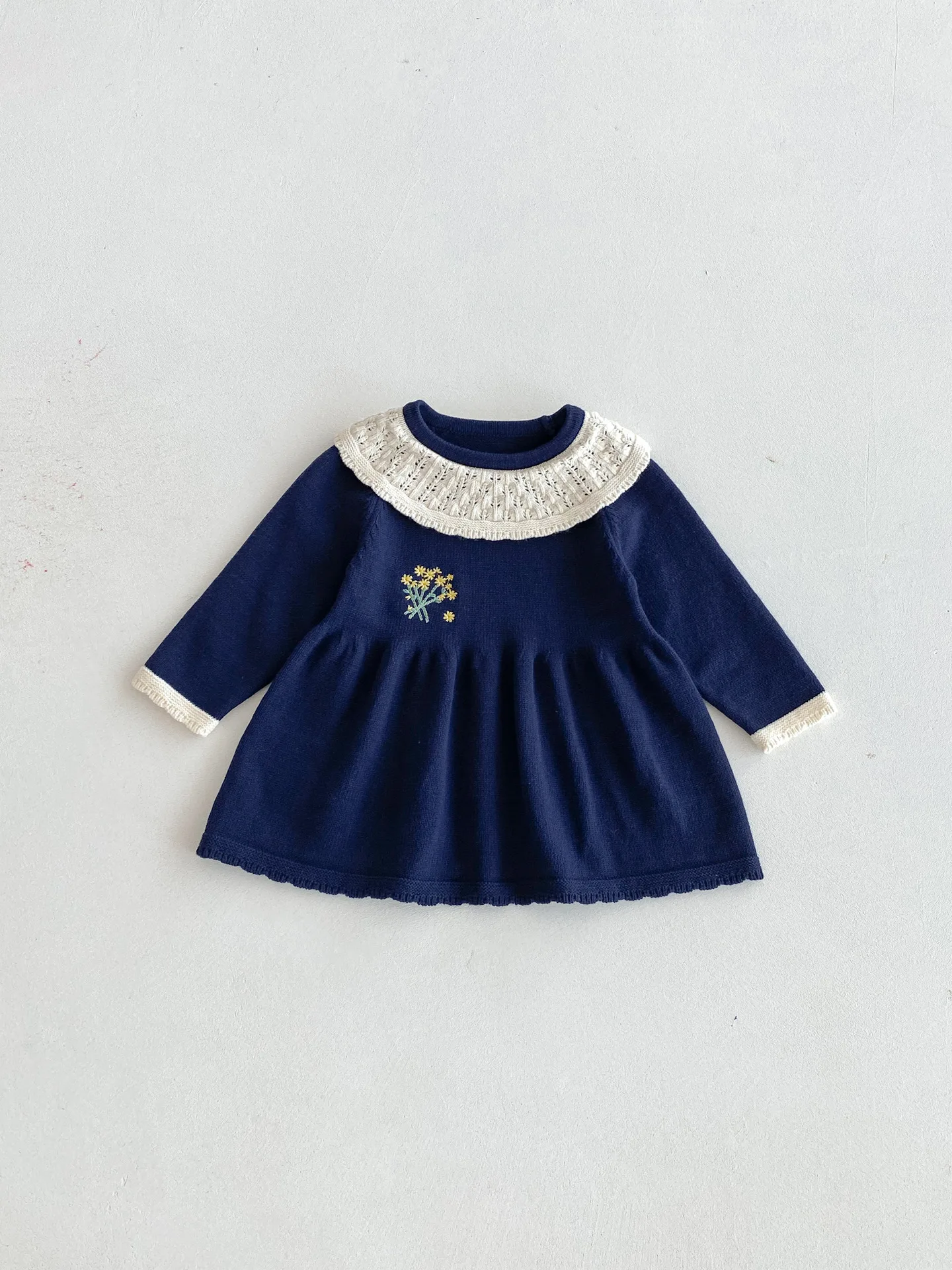 Осенне-зимнее вязаное платье для маленьких девочек, детское теплое платье-свитер с длинными рукавами, милые платья принцессы с цветочной вышивкой для девочек