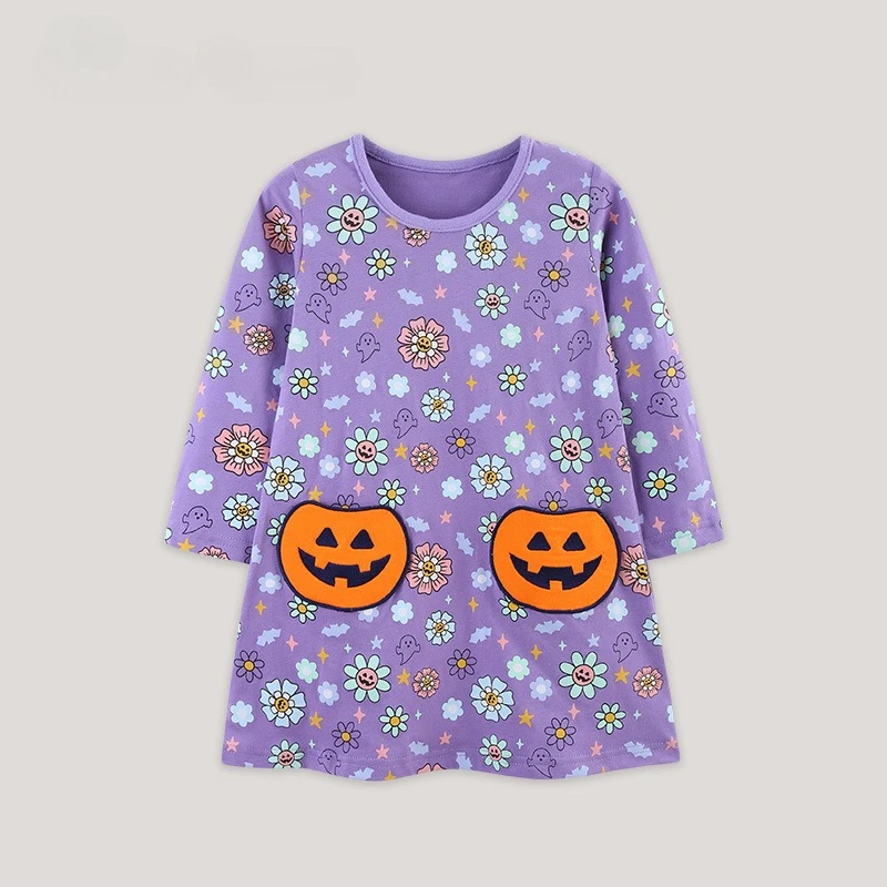 Новинка 2023 года, детское платье на Хэллоуин для маленьких девочек, милое фиолетовое платье с тыквой и цветочным принтом, кавайное платье принцессы с длинными рукавами, хлопок, От 2 до 7 лет