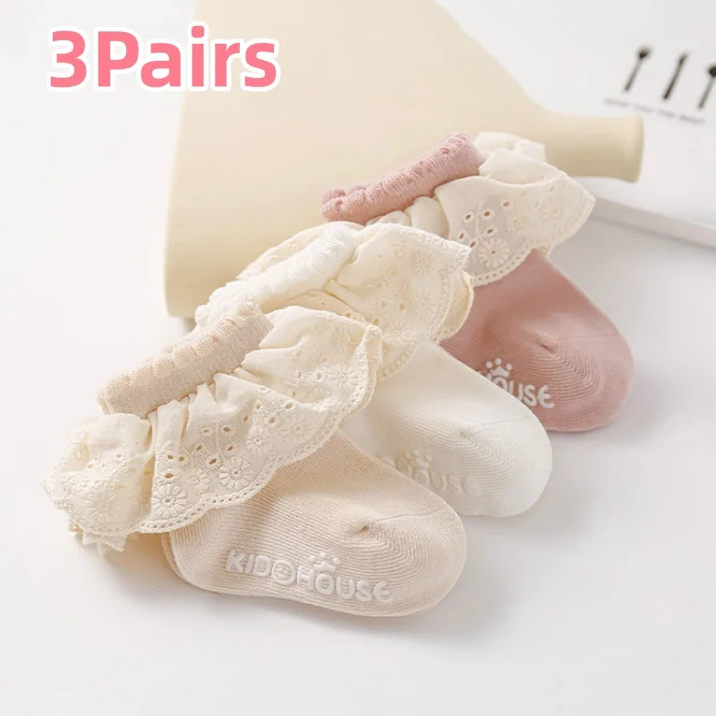 Набор из 3 пар детских носков для девочек (0-3 года): весенне-осенние, с кружевной отделкой, в стиле принцессы, хлопковые, бесшовные, противоскользящие, короткие носки для малышей