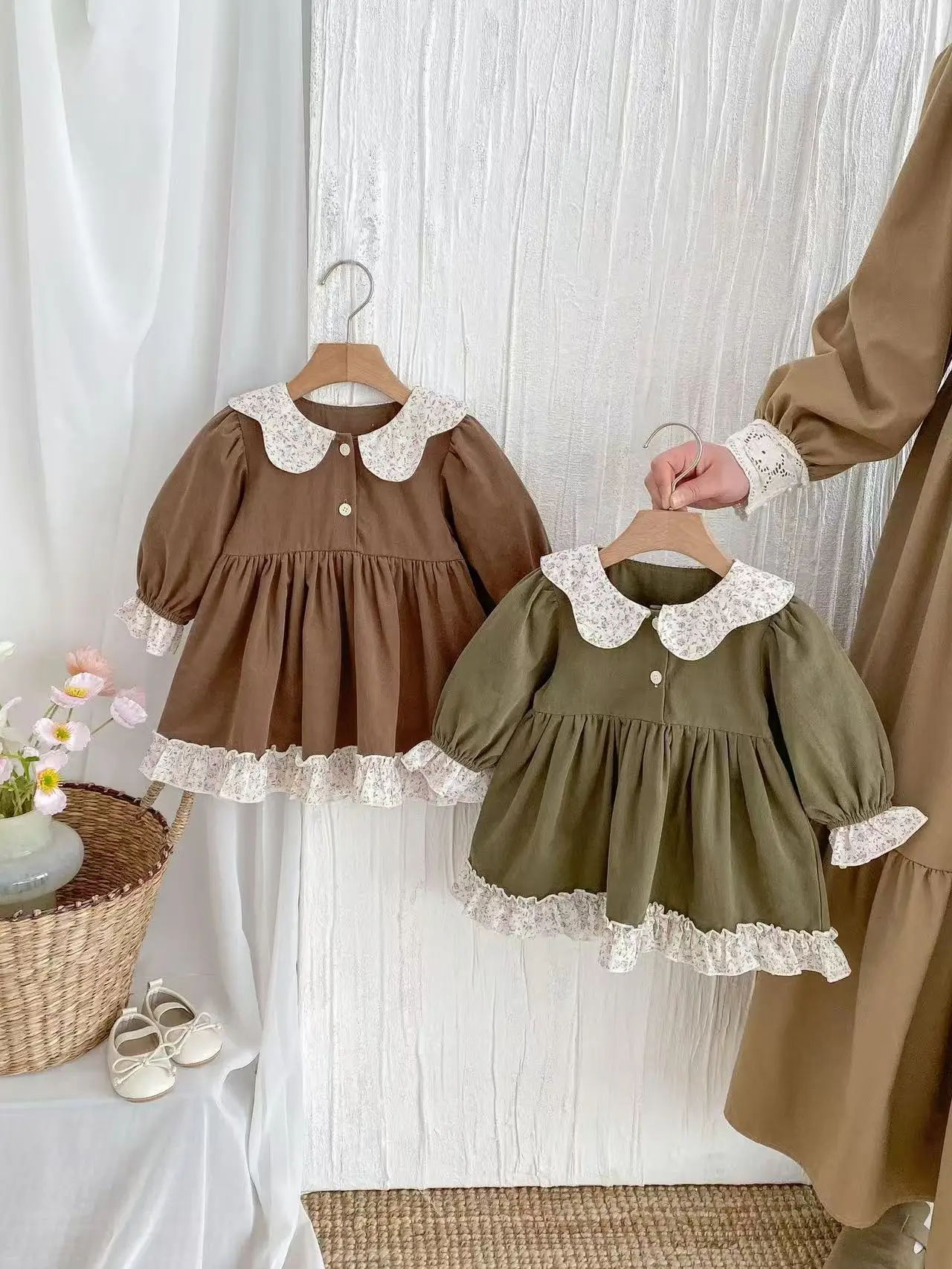 2025 г., корейские стильные платья с длинными рукавами для девочек на весну и осень, простое платье принцессы с цветочными лацканами, детская одежда для малышей