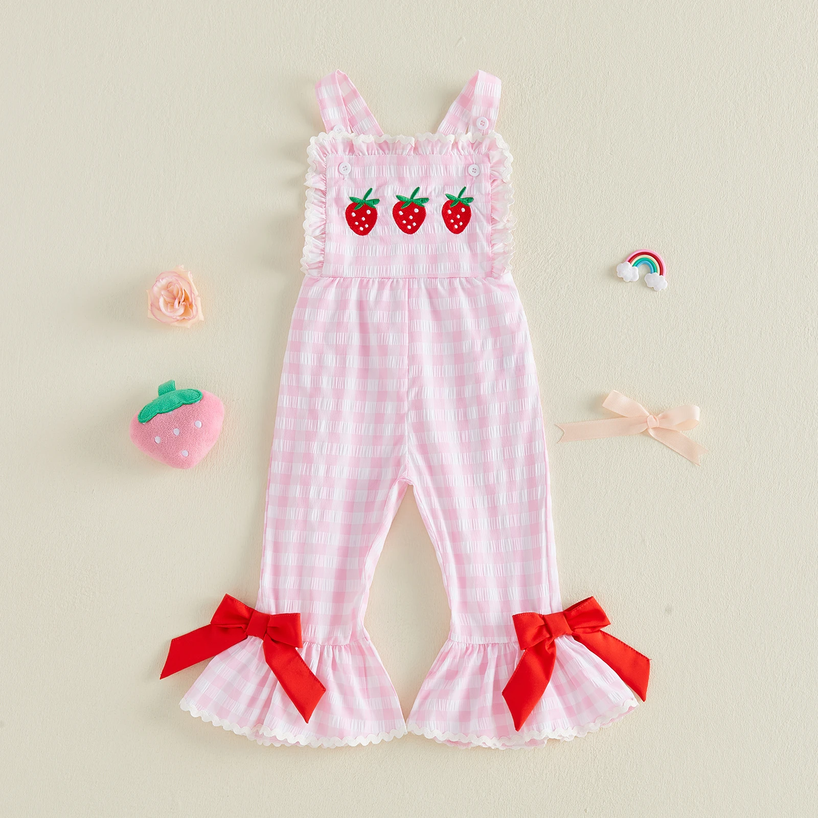 Комбинезон для маленьких девочек в клетку с вышивкой клубники, милый комбинезон без рукавов для младенцев, комбинезон с расклешенными штанинами, летняя одежда для новорожденных